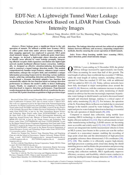 地科学院研究生刘振宇以第一作者身份在SCI期刊《IEEE Journal of Selected Topics in Applied Earth Observations and Remote Sensing》上发表题为“EDT-Net: A Lightweight Tunnel Water Leakage Detection Network Based on LiDAR Point Clouds Intensity Images”的研究论文,williamhill威廉希尔官网为论文第一署名单位,研究生刘振宇为第一作者,副教授高贤君为论文通讯作者。