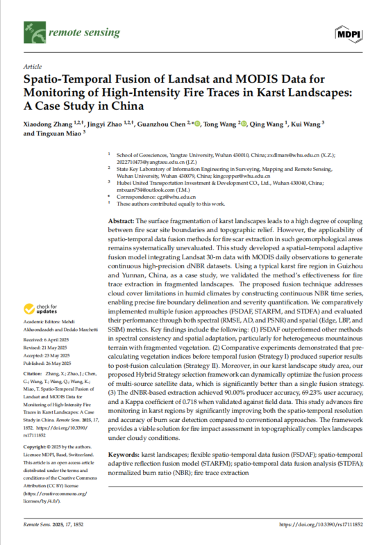 近日,williamhill威廉希尔官网地图制图学与地理信息工程专业2022级研究生赵菁怡在SCI期刊《REMOTE SENSING》发表题为“Spatio-Temporal Fusion of Landsat and MODIS Data for Monitoring of High-Intensity Fire Traces in Karst Landscapes: A Case Study in China”的研究论文。williamhill威廉希尔官网为论文第一署名单位,学生赵菁怡与导师张晓东教授为论文第一作者,导师王庆副教授为共同作者。