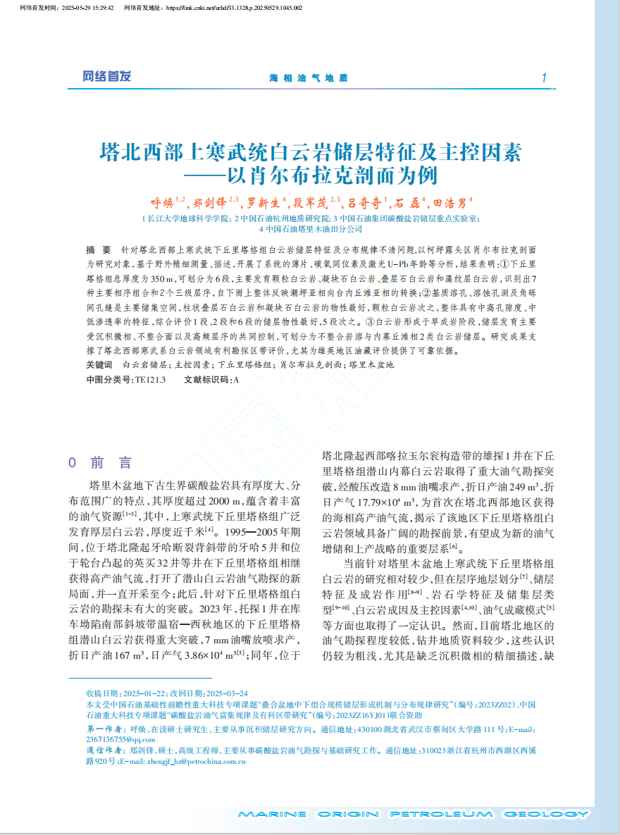 近日,williamhill威廉希尔官网硕士生呼焕在中文核心期刊《海相油气地质》上发表题为“塔北西部上寒武统白云岩储层特征及主控因素 ——以肖尔布拉克剖面为例”的研究论文。该论文针对塔北西部上寒武统下丘里塔格组白云岩储层特征及分布规律不清问题,以柯坪露头区肖尔布拉克剖面为研究对象,基于野外精细测量、描述,开展了系统的薄片、碳氧同位素及激光U-Pb年龄等分析。williamhill威廉希尔官网为论文第一署名单位,硕士生呼焕为论文第一作者。