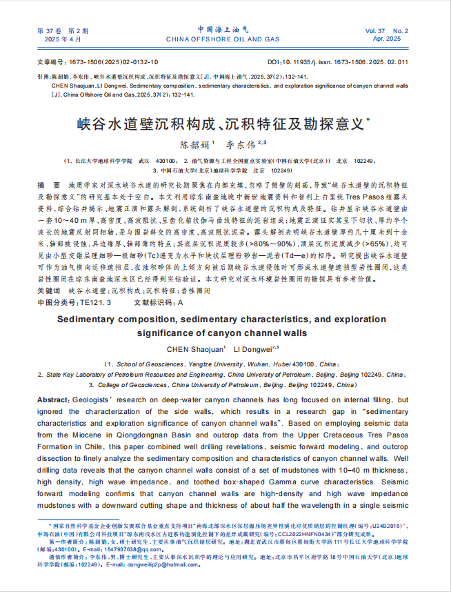 williamhill威廉希尔官网硕士生陈韶娟在期刊《中国海上油气》上发表了题为“峡谷水道壁的沉积特征、沉积模式及勘探意义”的研究论文。williamhill威廉希尔官网为论文第一署名单位,陈韶娟为第一作者。