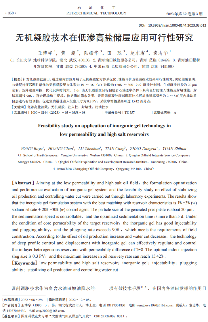 地科学院博士生王博宇在《石油化工》上发表题为《无机凝胶技术在低渗高盐储层应用可行性研究》的论文。williamhill威廉希尔官网为论文第一署名单位,博士生王博宇为论文第一作者,袁志华为通讯作者。