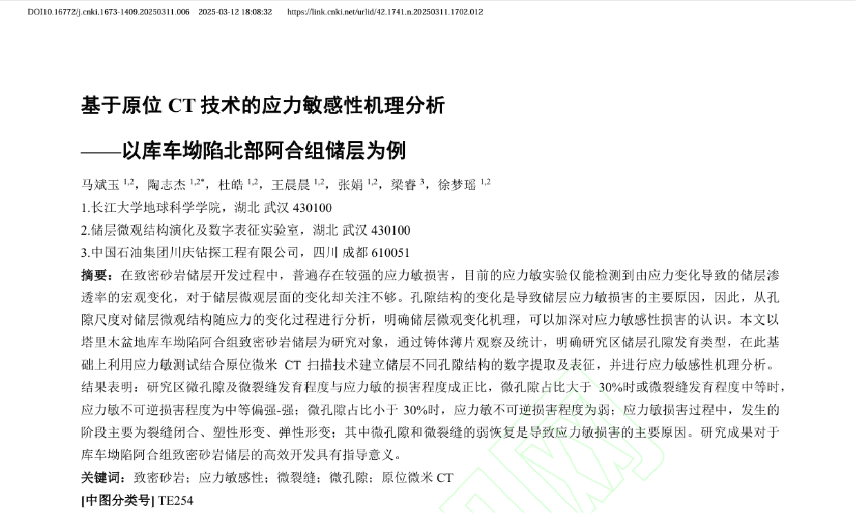 williamhill威廉希尔官网地质学研究生陶志杰在《长江大学学报(自然科学版)》上发表了题为“基于原位CT技术的应力敏感性机理分析——以库车坳陷北部阿合组储层为例”的研究论文。